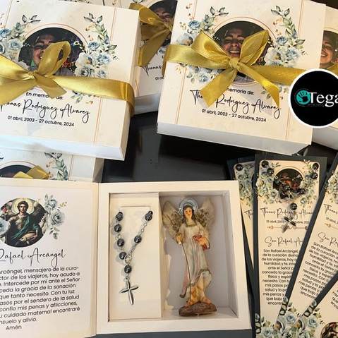 Detalles personalizados para conmemorar el recuerdo de un ser amado.Además, se puede incluir alguna frase conmemorativa, oración para rogar por el alma del fallecido o algún detalle de consuelo escrito por la familia.